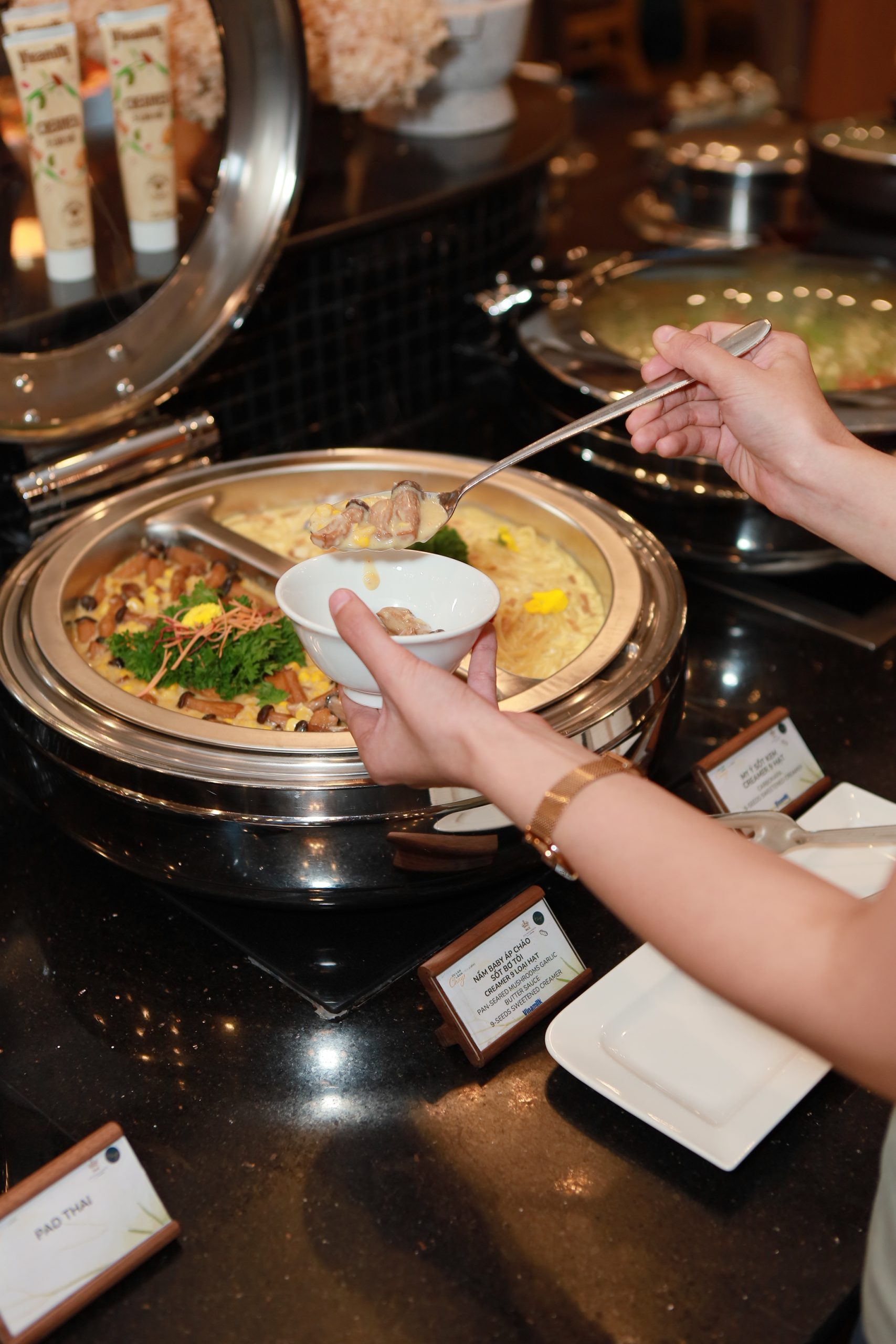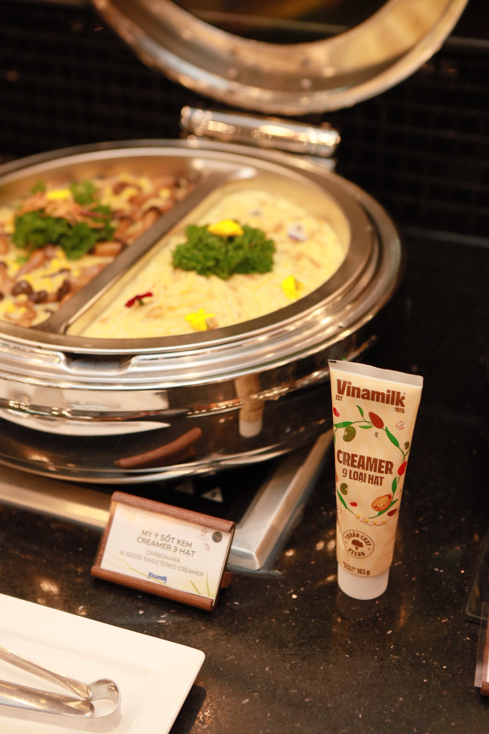 Với sự đồng hành của Vinamilk, đặc biệt là dòng sản phẩm creamer thuần chay 9 loại hạt, các đầu bếp Chay Garden đã ươm mầm sáng tạo và mang đến những món ăn đặc sắc cho tiệc buffet Vu Lan Chay Lành: Mỳ Ý xốt kem 9 hạt, Súp bí đỏ 9 hạt, Nấm xốt bơ tỏi 9 hạt, Panna cotta 9 hạt,… Mỗi món ăn không chỉ kế thừa và phát triển tinh hoa ẩm thực của Chay Garden mà còn làm bừng lên hương vị thơm bùi, sánh mịn, đậm vị hạt của creamer 9 loại hạt – kem đặc thuần chay đầu tiên tại Việt Nam.