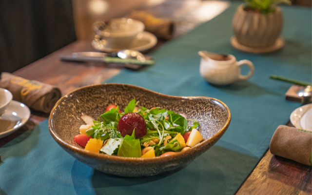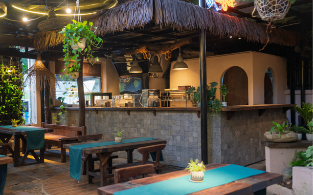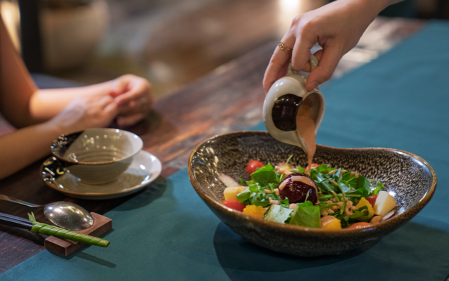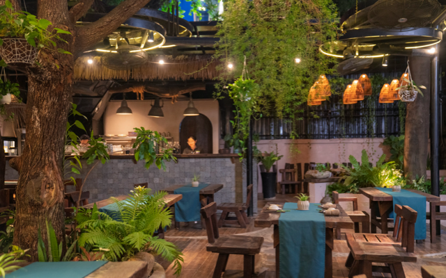 Ván thuyền cũ được tái sinh thành bàn ghế và nội thất, dưới những tán cây xanh mát, mở ra một không gian hiện đại, sáng tạo cho những bữa chay thanh lành.